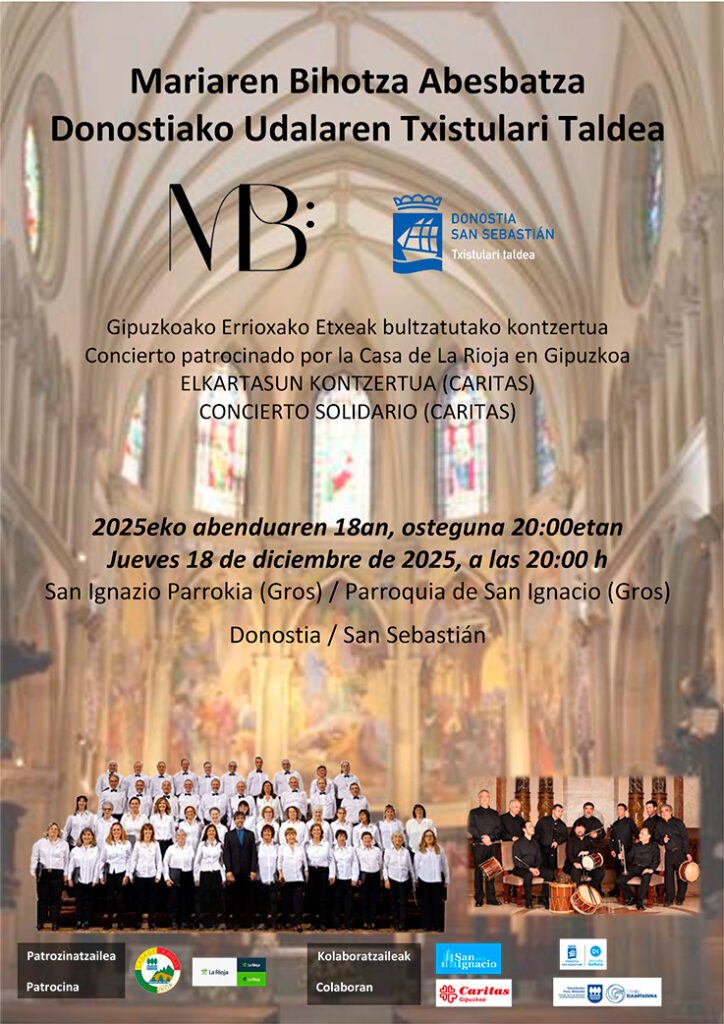 El grupo coral Mariaren Bihotza Abesbatza, junto con el Grupo de Cuerdas del Ayuntamiento de Donostia / San Sebastián, ofrece un concierto solidario a favor de Cáritas.