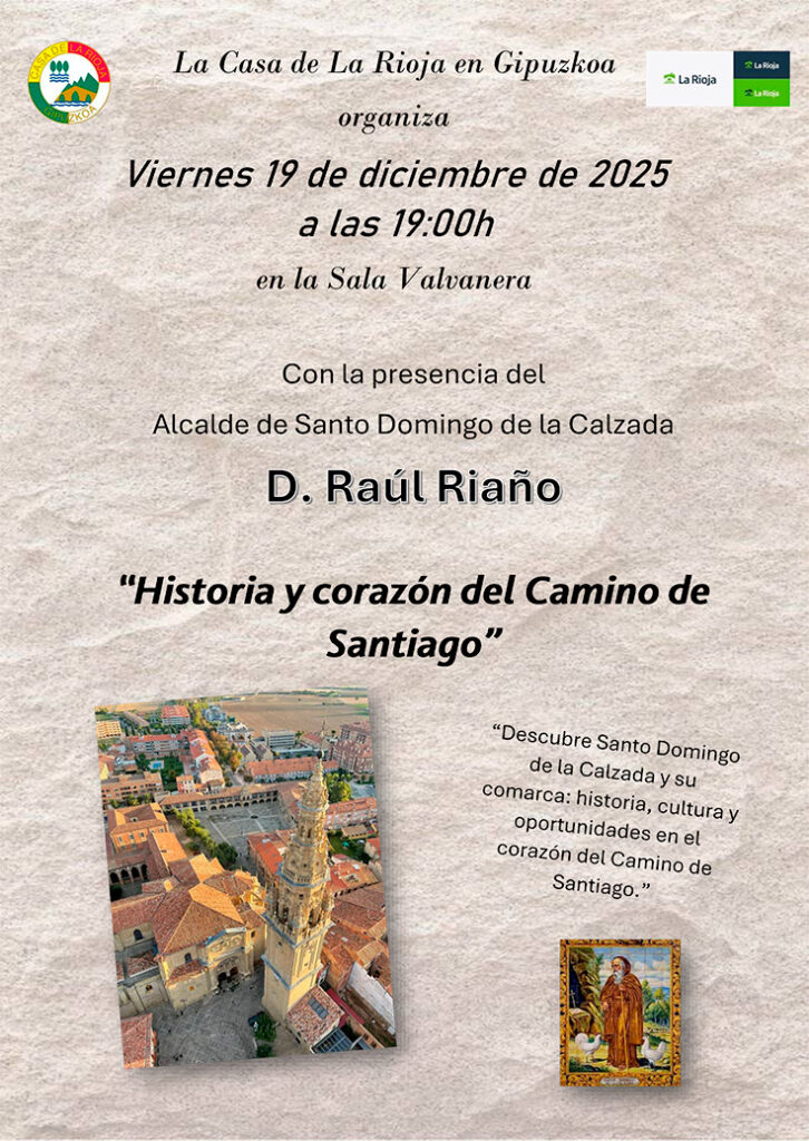 La Casa de La Rioja en Gipuzkoa organiza el próximo viernes 19 de diciembre de 2025, a las 19:00 horas, una charla cultural en la Sala Valvanera dedicada a uno de los grandes referentes del Camino de Santiago: Santo Domingo de la Calzada.